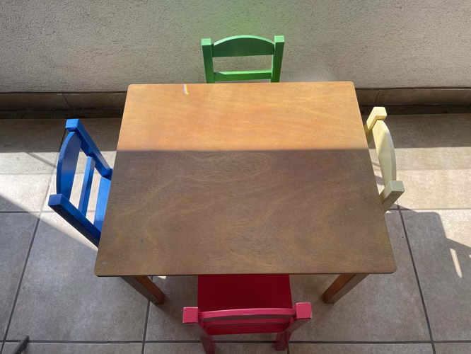 Mesa madera y 4 sillas: verde, azul, amarilla y roja.