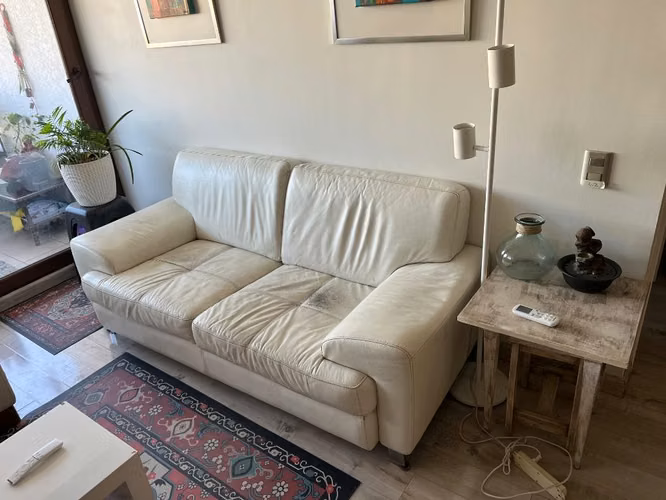 Se vende sillón 2 cuerpos, marca Rosen, cuero blanco, con daños por mascota pero recuperable.
