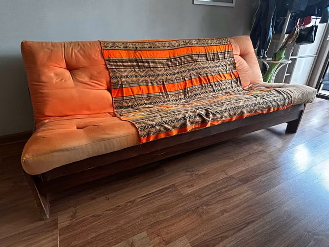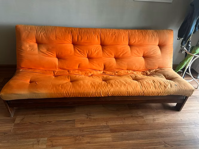Sofá cama Futonline en buenas condiciones, con desgastes propios del uso en la tela. Mecanismos de apertura y cierre en perfecto estado.