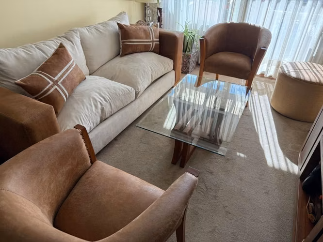 Cuero natural con gamuza beige, base en madera, incluye 2 cojines, poco uso