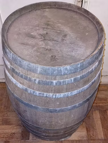 Barriles o Barricas antiguo de vino, el cual es redondo por su estructura, con el agujero para sacar el líquido (sin el tapon) con capacidad de 180 litros.