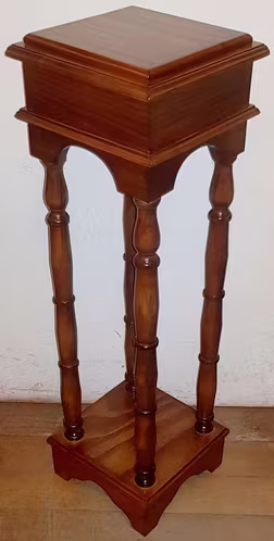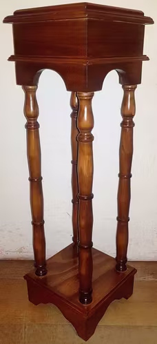 Pedestal estilo taburete rectangular cuadrado, el cual posee 4 pilares tallados, con un soporte cuadrado con alto relieve, además la cubierta también cuadrada también con un cuadrado más pequeño de alto relieve, con una moldura con forma de puente en los 4 lados.
