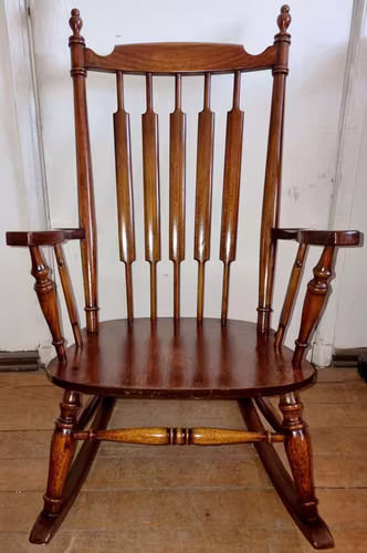 Sillón Mecedora de Marca CIC, el cual posee una moldura redondeada con 2 pequeños pilares de madera, en el respaldo posee 5 palos de madera, sumado a los 2 de la estructura, con 2 brazos redondeados con palos torneados. El asiento es redondeado, con un cojín de color blanco invierno. Finalmente, posee el balancín de madera que va unido a una estructura de madera torneada.