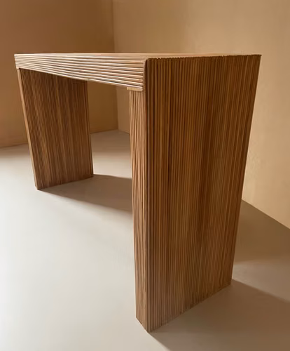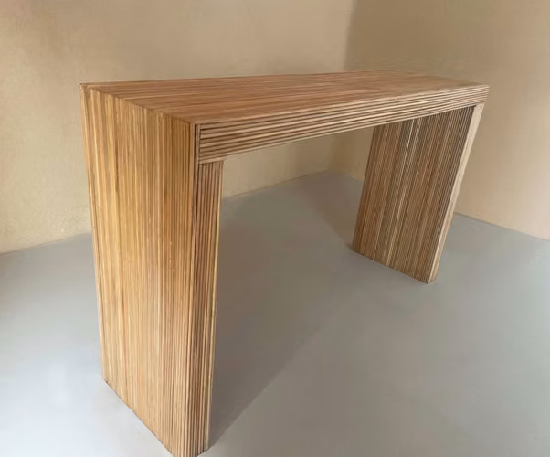 El entretejido de los palillos de coihue, tanto en la cubierta como en las patas, le da una textura y belleza impactante en donde se puede apreciar la mezcla del arte y la artesanía.