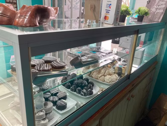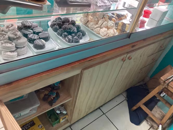 Tiene un mueble en el cual se apoya la vitrina, que por el reverso tiene cajones y puertas para guardar mercadería, paquetería o materias primas.