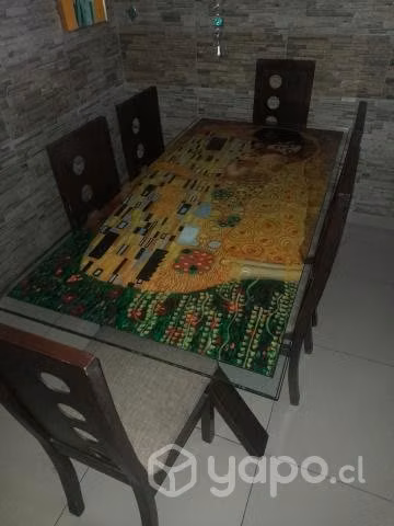Se vende en muy buen estado , mesa de vidrio lo de mas madera , sillas con diseño medidas 1.80mt x 90 sillas 1 mt de altura , vidrio con foto de El Beso de gustav klimt