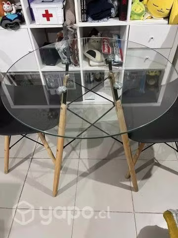 La mesa viene con las 4 sillas, no se venden por separado. 100cm de diámetro, patas de madera, soportes metálicos y cubierta de vidrio. Las sillas son plásticas con las patas de madera y soportes metálicos.
