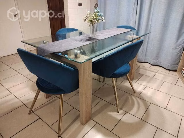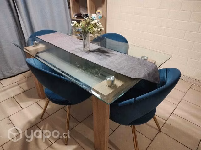 En venta hermoso comedor de vidrio , medidas 1,50 cm x 90 cm , con sus 4 sillas en color azul en perfecto estado .