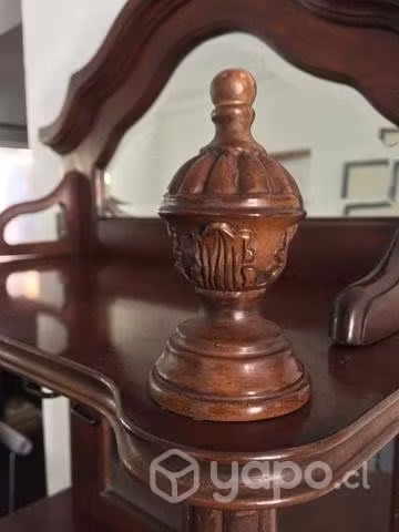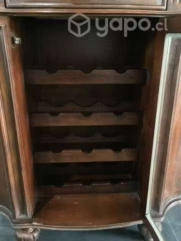 Mueble Bar Laura Ashley, estilo vintage con varios detalles como su puerta con cristal curvo, colador de copas, compartimientos laterales para cristalería, volumen interior con posador de botellas de vino, tragos, etc. Incluye oculta una mesa coctelera que se desliza desde el interior para poder servir tragos y preparaciones con espacio. Terminaciones de madera con esferas talladas y robustas patas elevadas para soportar el peso.