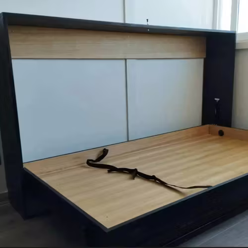 Cama abatible 1 o 1. 5 plazas., completamente madera barnizada, y frente elegante de palillaje, también madera, barnizada. Es muy, útil, firme cómoda y con muchobestilo