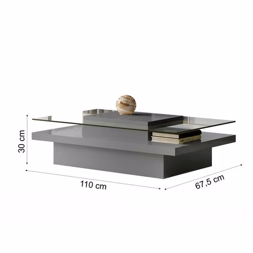 Información adicional Moderna mesa de centro de diseño alternativo, color gris, mide 110 cm de largo x 30 cm de alto x 67,5 cm de profundidad. Fabricada en madera aglomerada MDF - MDP con espesores de 15, 25 y 45 mm, la cubierta está diseñada con un vidrio de 8 mm de espesor, dándole un aíre de modernidad a su ambiente, excelentes terminaciones con pintura UV.