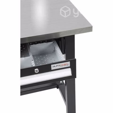 Superficie de acero inoxidable con alma de madera de 3 cm de espesor Incluye cajón de 411x572x100mm (Largo/Fondo/Alto) con capacidad de carga de 100 Kg, apertura en un 85% y 6 separadores de acero inoxidable Patas de 40x60 mm y 2 mm de espesor Incluye travesaño inferior