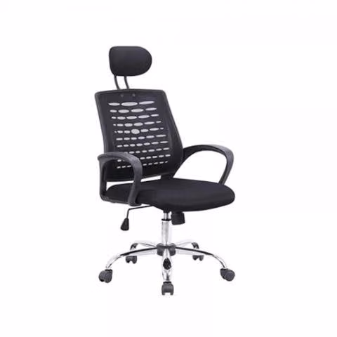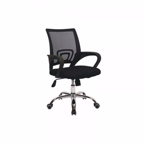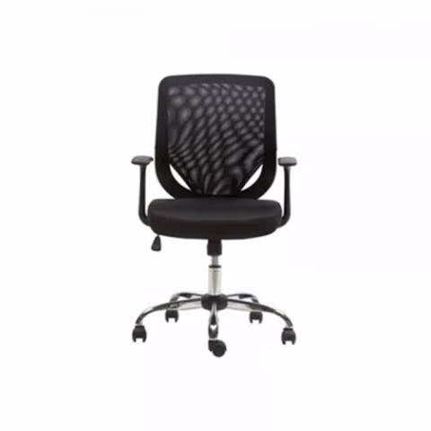 Respaldo en malla, tapiz en tela, brazos fijos, altura regulable y base estrella cromada de alta resistencia.