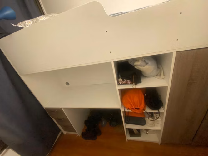 Camarote de una plaza con clóset y escritorio usado. Tiene algunos detalles, pero sigue siendo totalmente funcional. Viene desarmado, pero tienen que venir a buscar las piezas.