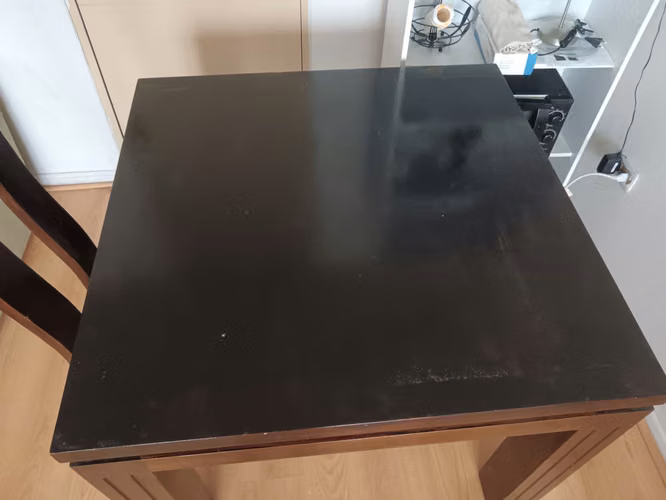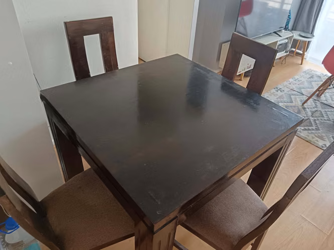 comedor 4 sillas de dimensiones 1mt x 1 mt, 0,75mt altura, ideal para casa pequeña o departamento, hecho de 100% madera RAULI. tiene detalles pequeños en la pintura y las sillas con detalles por el uso. PRECIO CONVERSABLE.