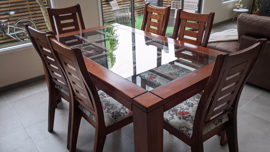 - Punta ArenasMesa con cubierta de vidrio y soporte madera de lenga con 6 sillas.