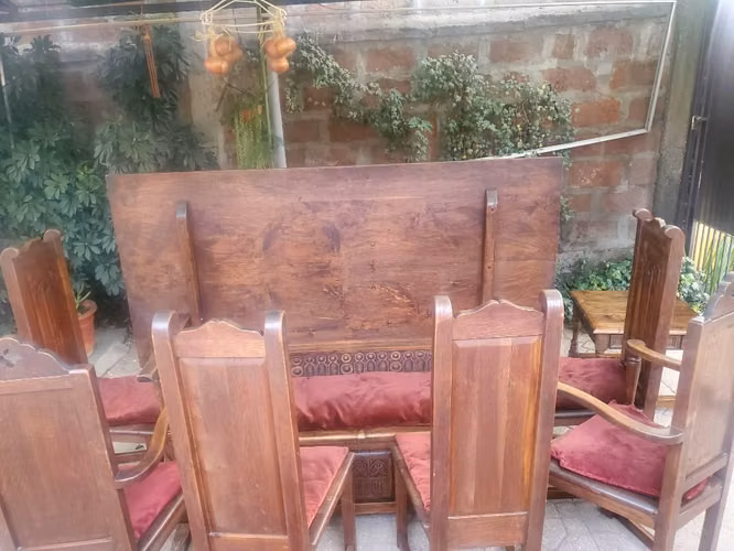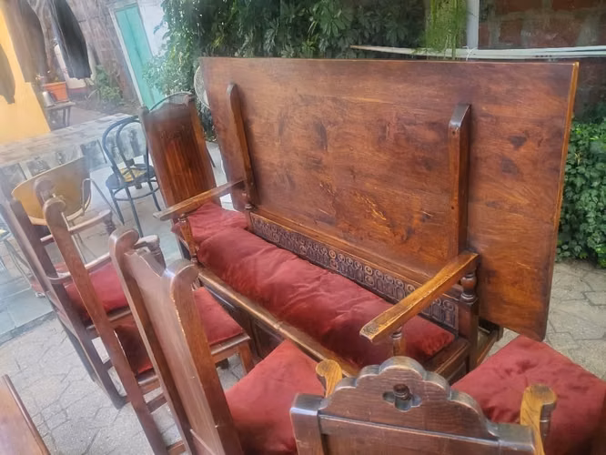 La mesa al igual que las sillas presentan adornos tallados,la mesa es abatible quedando como asiento y a la vez como baul.