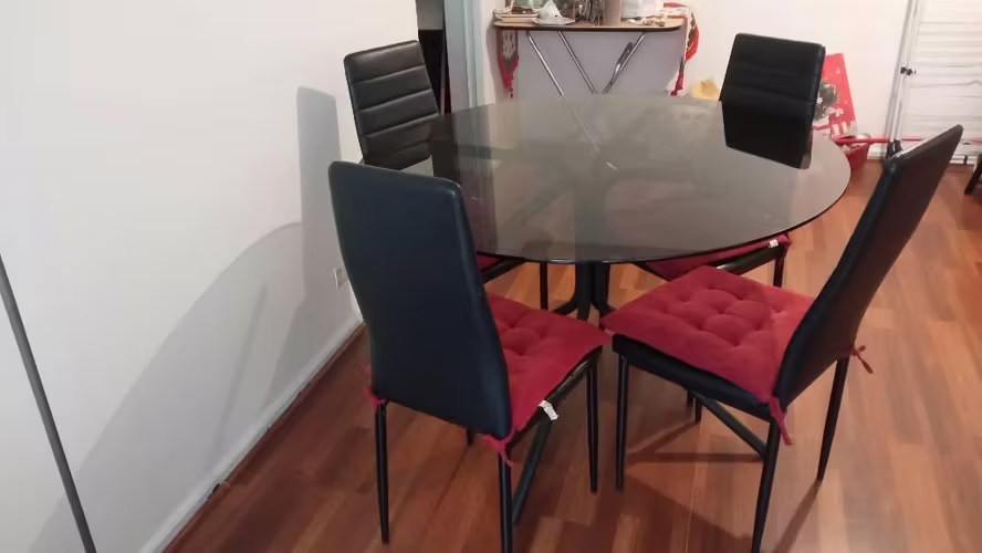 Mesa redonda vidrio tono ahumado, cuatro sillas metálicas todo funcionando perfecto.