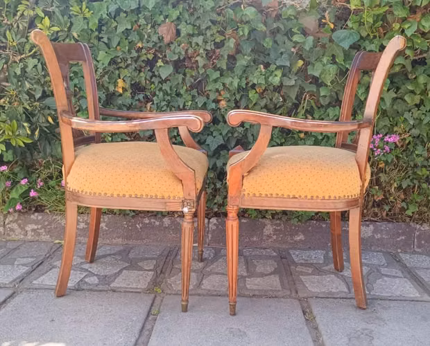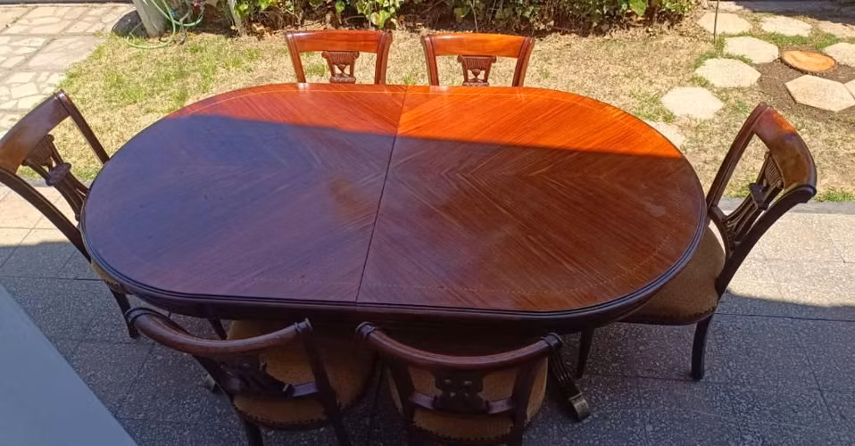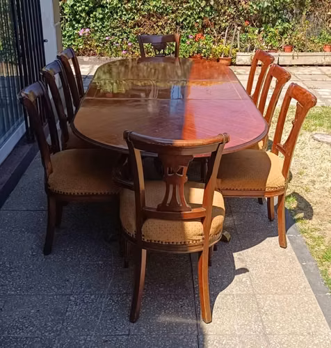Comedor madera luis XV $790.000 .Mesa (largo 185)extensible ( 235), ancho 105 y alto 75, más 6 sillas y dos sitiales , ancho 105 y alto 75. Sin extensión caben 6 sillas y con la extensión 8 sillas. Los dos sitiales con detalles uno con pata rota y otro con un apoya brazo roto. La extensión de la mesa decolorada, esa se guarda bajo la mesa.