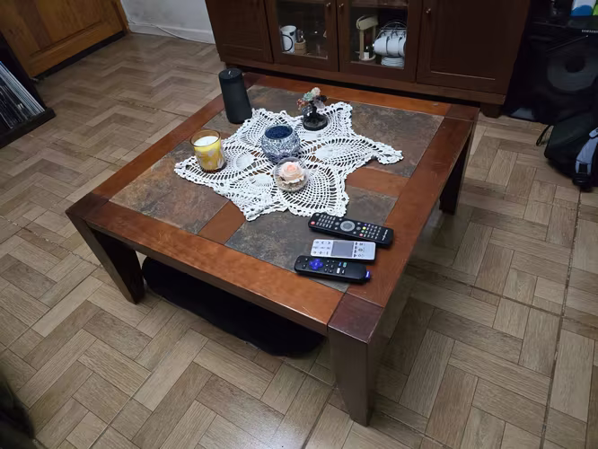 Mesa de centro, en juego con comedor en muy buen estado, con aplicaciones de piedra pizarra, muy firme. $80.000