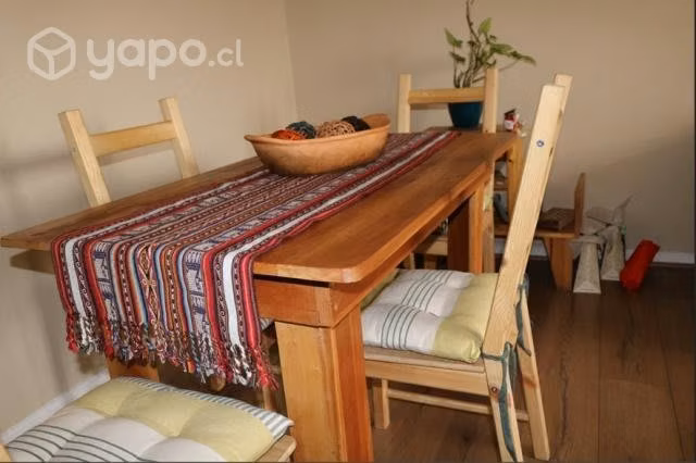 Vendo juego de comedor rústico. Incluye 4 sillas Ikea (9 meses de uso), mesa de raulí (120 largo, 68 ancho y 78 alto), cojines de las sillas, camino de mesa (hecho a mano comprado en cuzco) y fuente de greda (hecha a mano en Vichuquen)