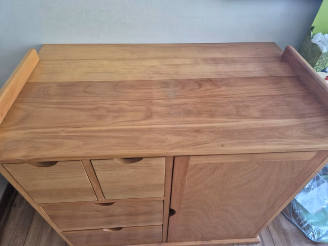 Cómoda de rauli de 110 x 95 de alto. ancho 50 con extensión de 15 cm. Puntas redondeadas. Perfecto estado.