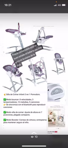 - silla de comer con nivel y tambien es mesedora el cable a corriente no lo tengo pero igual sirve todo, en buen estado. 40.000