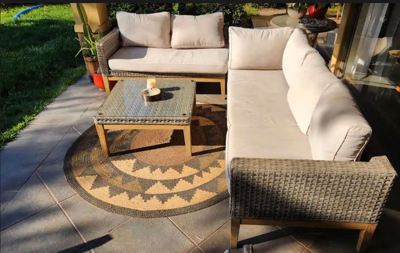 A la venta un Juego de Living para terraza seccional de 50% aluminio y 50% Ratán Poliéster, con dos sillones y una mesa de centro con cubierta de vidrio. Incluye además los cojines como aparecen en la fotografía, de poliéster.