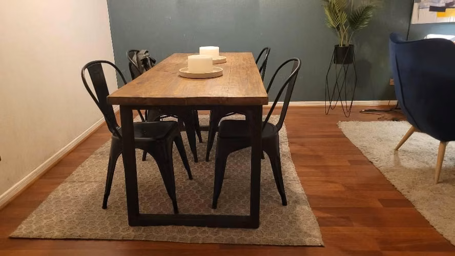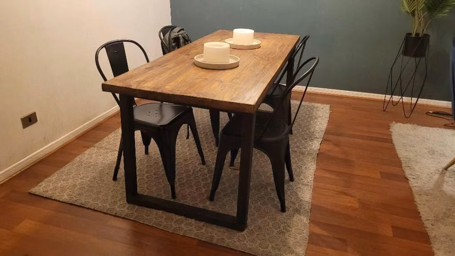 Mesa comedor rectangular con cubierta de madera y patas negras de fierro.
