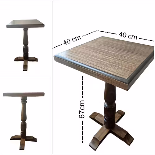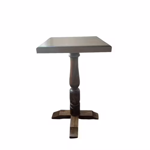 La parte superior es cuadrada con un tamañano adecuado para uso como mesa auxiliar o de centro en espacios pequeños, la base es sólida, con un diseño de único pedestal que se ramificaciones en 4 patas cortas que aportan estabilidad.
