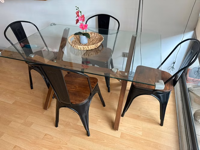 Material: Vidrio templanto las patas de la mesa de metal, las sillas la estructura de metal y el asiento madera.