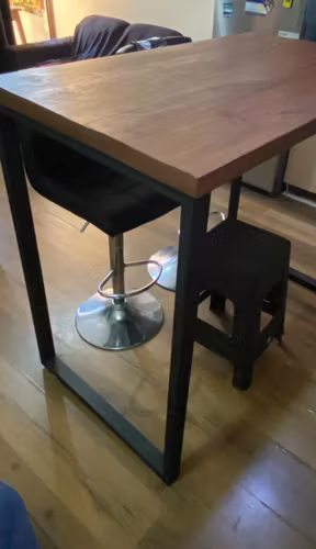 Se vende por no uso mesa tipo bar son pisos, medidas 120x10x70 patas de metal y barra para balcón con dos pisos de madera. Por mudanza ya no las usamos