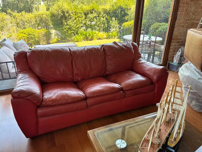 Sofás de tres cuerpos , excelente calidad, cuero de verdad, 2,0 metros de largo, 95 cm de ancho, color rojo . Pequeños detalles en algunas costuras de fácil reparación.