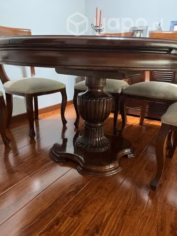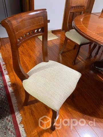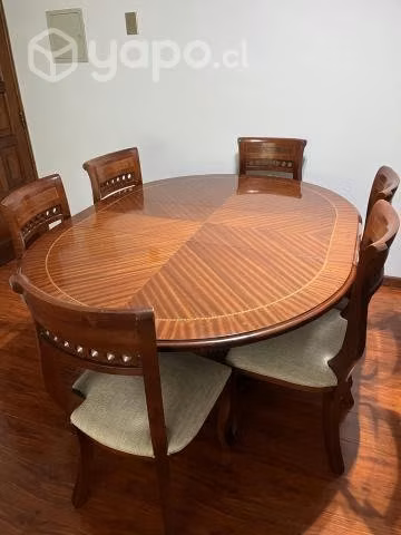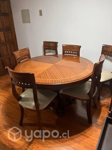 comedor madera caoba redondo extensible para seis personas, con 6 sillas en excelente estado, alto 76 cms., largo 130 cms., extensible a 180 cms. con fina marquetería, barniz, en excelente estado