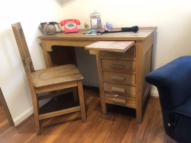 Escritorio antiguo de madera con 5 cajones y una silla.