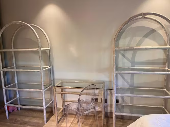 Hermoso diseño de 2 muebles de estantería hecha de madera sólida de bambú, muy maciza, atemporal de repisas y en juego un escritorio , se puede jugar en la forma de distribuirlos. Tamaño de cada estantería : frente 89 cms , alto:190 ,