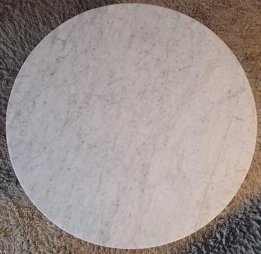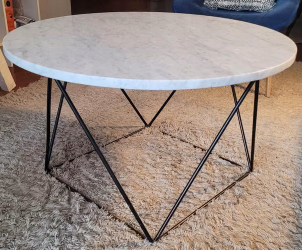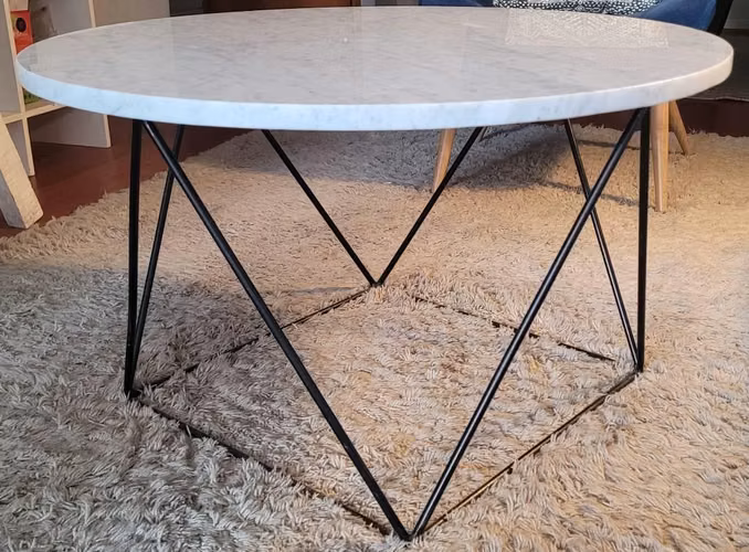 Mesa de centro de mármol blanco y base de fierro negro.